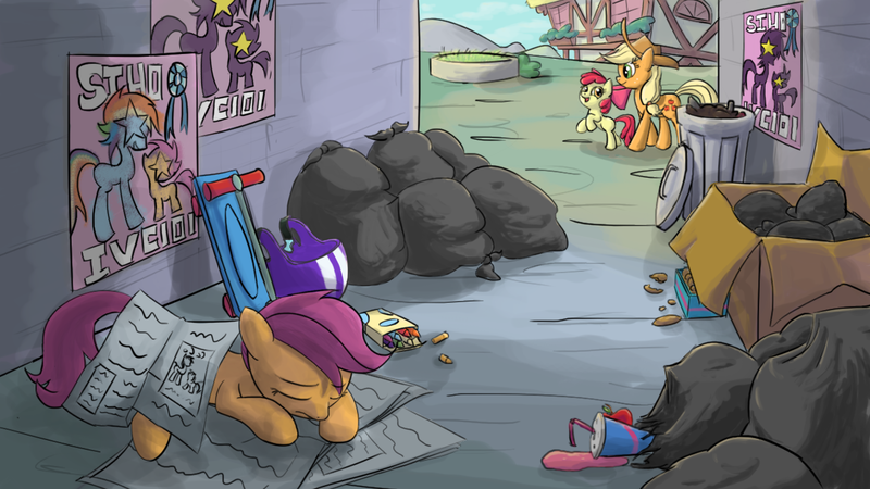 >scootaloo is moping in an alley.